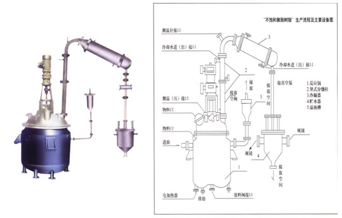 本全套裝置是用于生產(chǎn)不飽和聚脂樹脂、酚醛樹脂、環(huán)氧樹脂、ABS樹脂、油漆的關(guān)鍵設(shè)備。全套設(shè)備由反應(yīng)鍋、豎式分餾柱、臥式冷凝器、貯水器、溢油槽、管線(對(duì)稀釜)等組成,全套設(shè)備與物料接觸部分的采用不銹鋼制作。